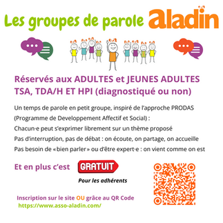 Ce moment est destiné aux adultes et jeunes adultes qui désirent mieux comprendre cette particularité . Il s'agit d'un espace de partage et d'échanges sans jugement sur divers sujets (sensibilisation, socialisation, travail , couple , amis, entreprise, conflits…). Chacun est libre, s'il le souhaite, de participer, poser des questions, partager son témoignage ou simplement écouter les expériences des autres.